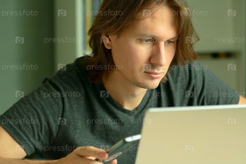Молодой человек с длинными волосами сидит за своим столом, усердно работает над ноутбуком. Его глаза сосредоточены на мониторе компьютера. Концепция домашнего офиса и удаленного трудоустройства