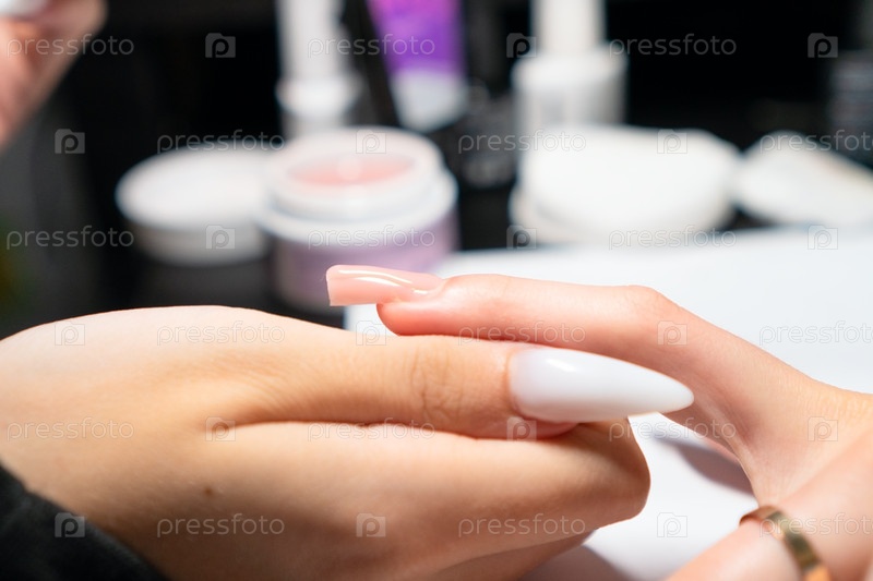 Профессиональный маникюр тщательно наносит гелевой лак во время процедуры удлинения ногтей, обеспечивая идеальное однородное покрытие и форму