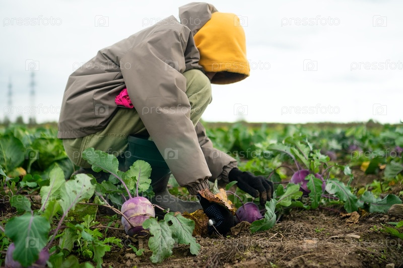 Веселый мальчик собирает свежие красные и фиолетовые колрабы на ферме. Сезонный овощ, домашние продукты, работа в открытом воздухе, здоровый образ жизни и гордость за сельскохозяйственные культуры