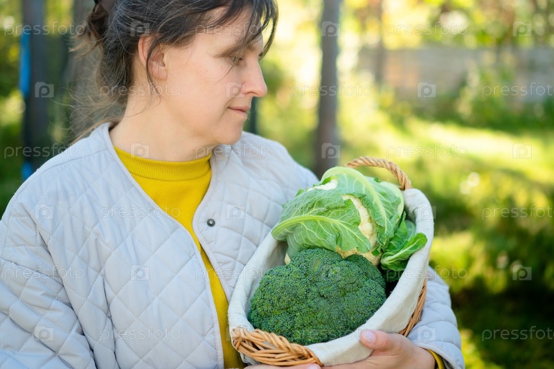 Веселая фермерка хранит свежую капусту и брокколи в корзине