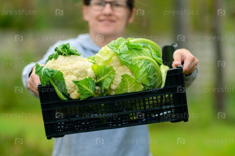 Женщина-фермерка с гордостью демонстрирует коробочку для выращивания цветной капусты