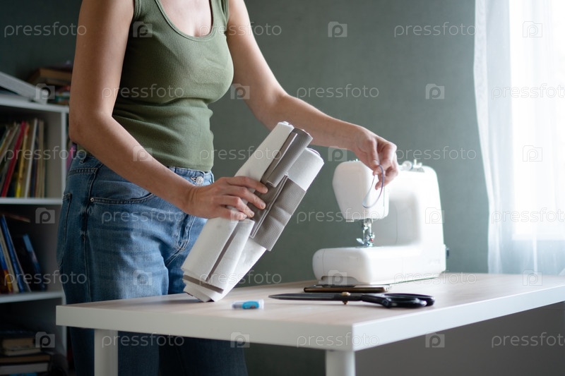 Женская портная выкладывает и расставляет ткань на большом рабочем столе в своей швейной студии.Процесс подготовки материалов для резки и пошива одежды