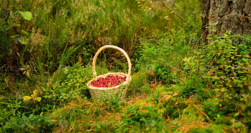 Горизонтальный баннер с полной корзиной клюквы в осеннем лесу