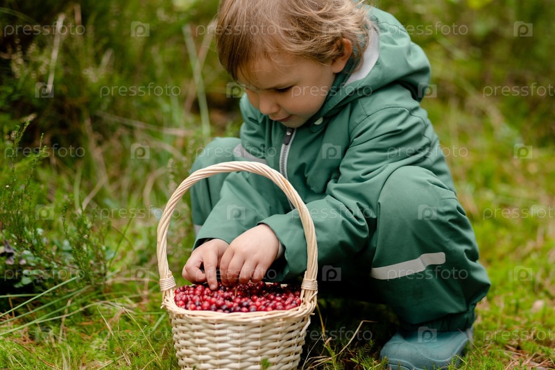 Маленький мальчик сидит на земле в осеннем лесу с корзиной, полной клюквенных ягод, сортирует ягоды и практикует развитие мелкой моторики