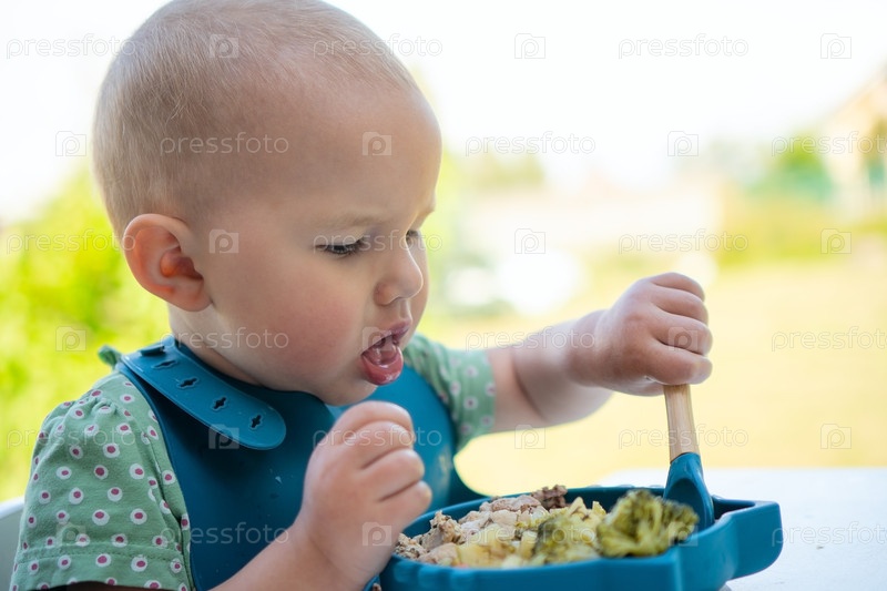 Маленький малыш практикует самостоятельные навыки питания с полезной кашей за столом, что является важной точкой отлучения и развития