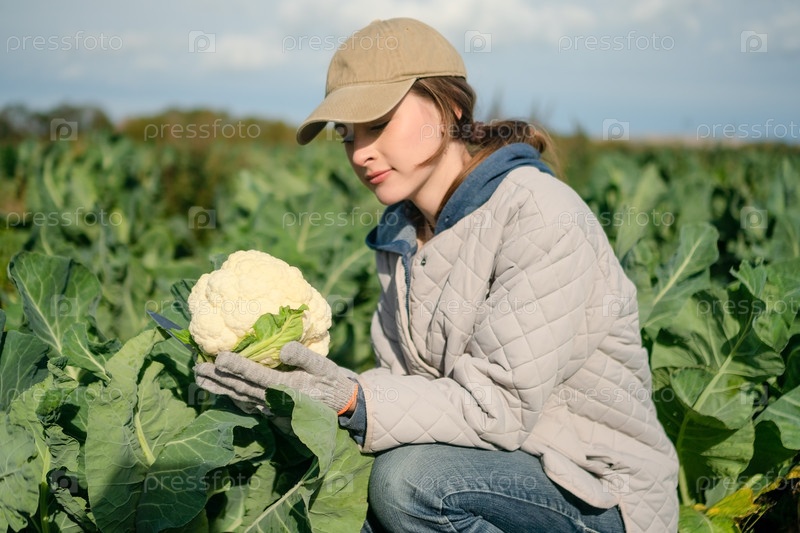 Женщина-фермер держит свежий урожай цветной капусты