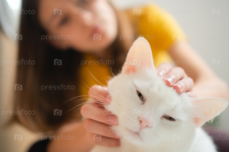 Молодая девушка нежно обнимает своего пушистого белого кота-компаньона.Теплый портрет, показывающий нежную связь между человеком и домашним животным