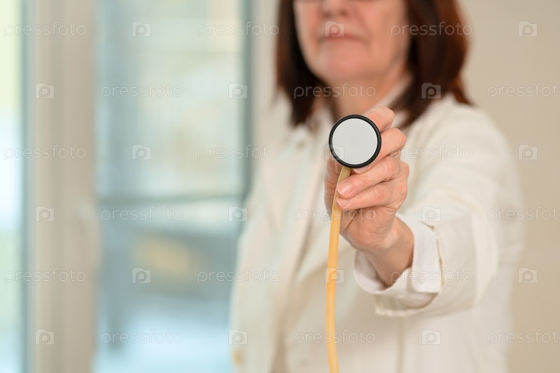 Близкий план опытной женщины-врача в белой форме, которая держит и наносит стетоскопическую диафрагму.Фокусируйтесь на обследовании дыхательных путей, диагностике, пневмонии, бронхите.Больничная медицинская сцена