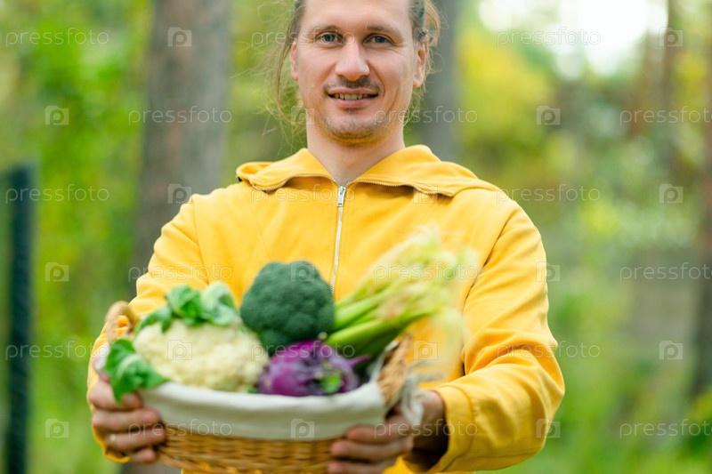 Улыбающийся фермер держит корзину с сезонными овощами
