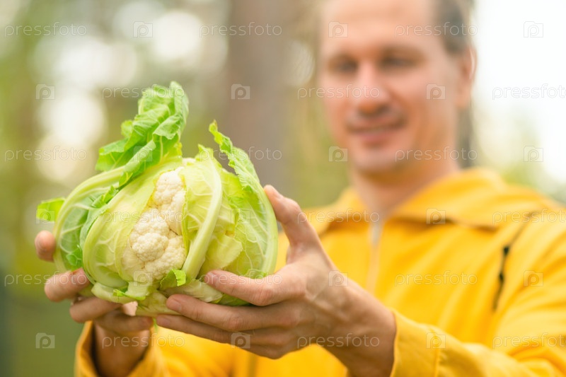 Человек-фермер гордо демонстрирует свежую цветочную капусту с урожая