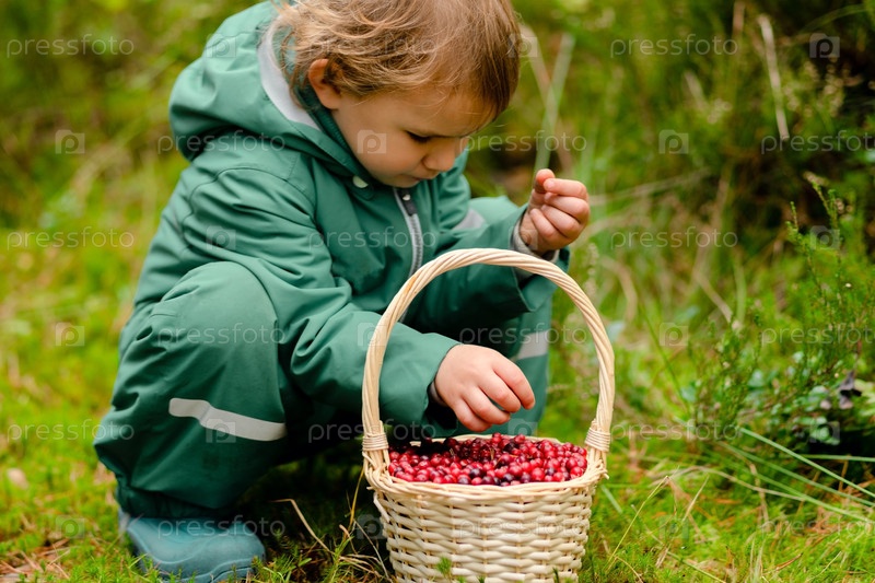 Малыш сидит и сортирует клюквы в осеннем лесу