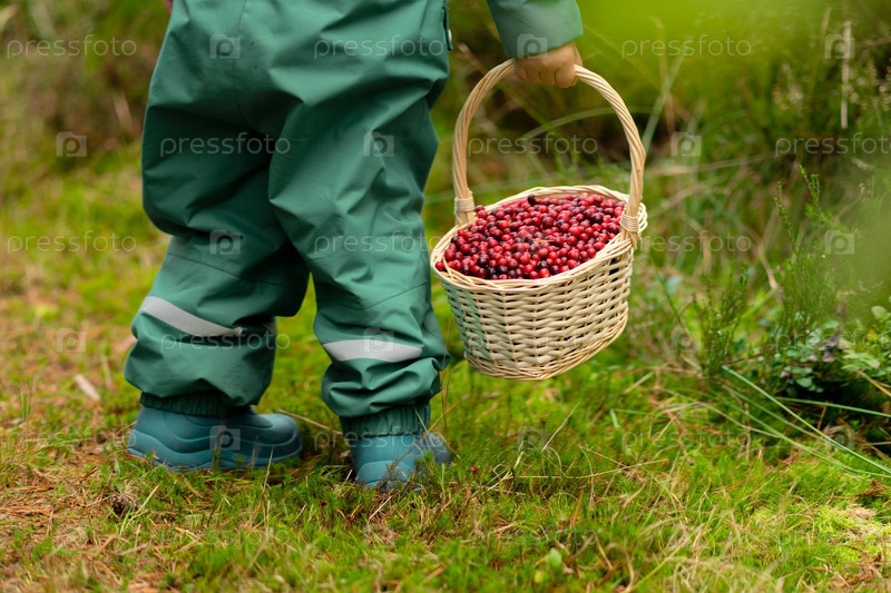 Ребёнок сзади с корзиной клюквы фокусируется на ногах и стопах
