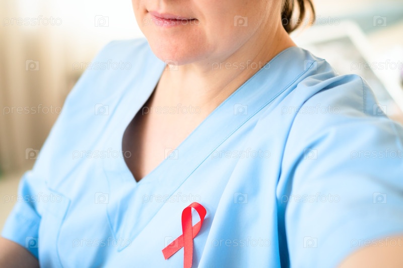 Молодая женщина-врач в комбинезонах делает селфи с красной лентой СПИДа, подчеркивая солидарность и поддержку людей, живущих с ВИЧ