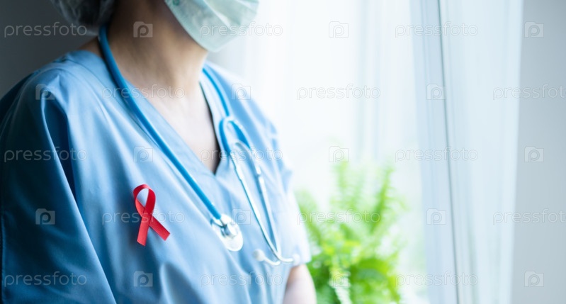 Медицинская женщина с красной лентой на униформе, горизонтальный баннер покрывает портрет для кампании по осведомлению о ВИЧ/СПИД