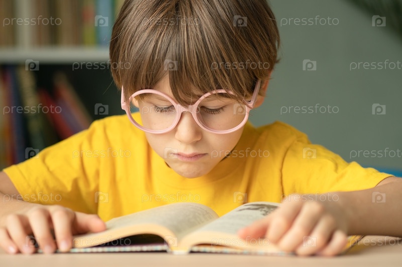 Счастливый маленький ученик с очками сидит за столом, опираясь на руку и вглядываясь в книгу. раннее детское образование, чтение, обучение, воображение, умное мышление и подготовка к школе