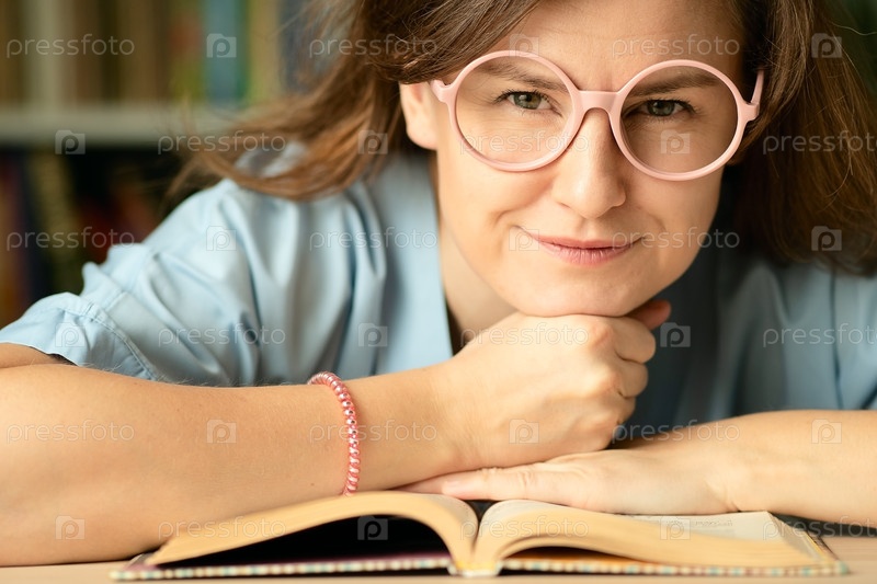 Молодая женщина в розовых круглых очках сидит за столом, опираясь на книгу.Она смотрит прямо в камеру с выражением лица, ожидающим интересного чтения