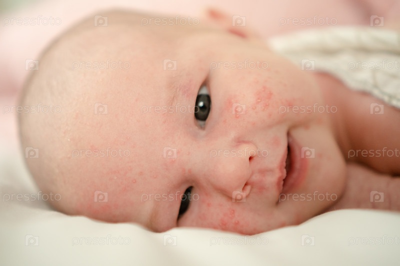 Близкий план новорожденного с чувствительной кожей, показывающий адаптивную сыпь, крошечные красные пятна и нежную улыбку