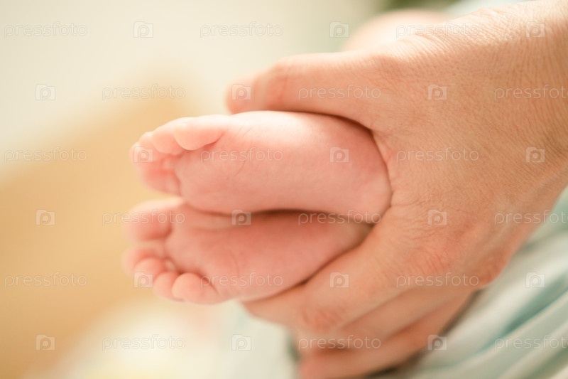 Новорожденные пальцы ног переплетены с заботливыми руками, момент нежности