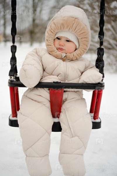 Очаровательный малыш, одетый в теплый сноуборд и наслаждающийся зимним качелем.Уютное платье и любопытный выражение лица подчеркивают радость от игры на свежем воздухе для ребенка или новорожденного в снежную погоду