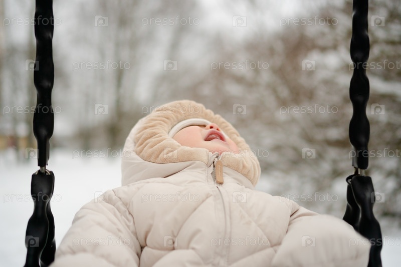 Очаровательный малыш, одетый в теплый сноуборд и наслаждающийся зимним качелем.Уютное платье и любопытный выражение лица подчеркивают радость от игры на свежем воздухе для ребенка или новорожденного в снежную погоду