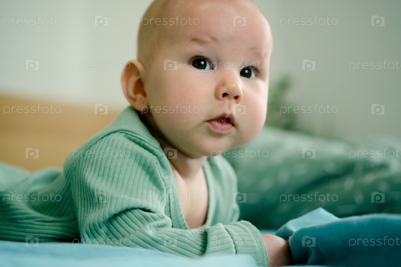 Ребенок в зеленом реберном одеяле лежит на синем, показывая любопытное выражение лица, которое подчеркивает гармонию цветов и комфорт уютной среды