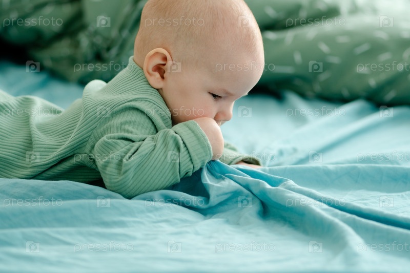 Ребенок в зеленом реберном одеяле лежит на синем, показывая любопытное выражение лица, которое подчеркивает гармонию цветов и комфорт уютной среды