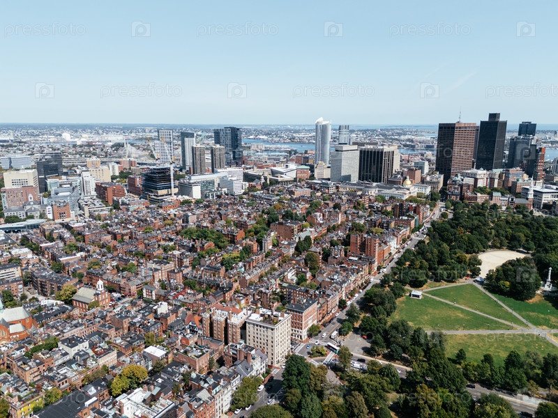 Аэрофотосъемка горизонта центра Бостона с небоскребами, исторической церковью и зеленой парковой авеню в солнечный день
