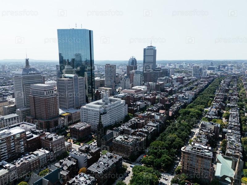 Аэрофотосъемка горизонта центра Бостона с небоскребами, исторической церковью и зеленой парковой авеню в солнечный день