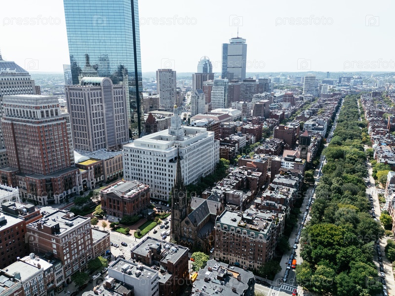 Аэрофотосъемка горизонта центра Бостона с небоскребами, исторической церковью и зеленой парковой авеню в солнечный день