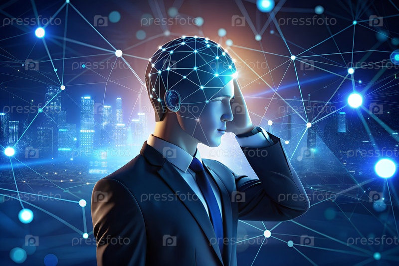 Человеческая касающаяся голова и ИИ-икона против агента ИИ с генеративным искусственным интеллектом