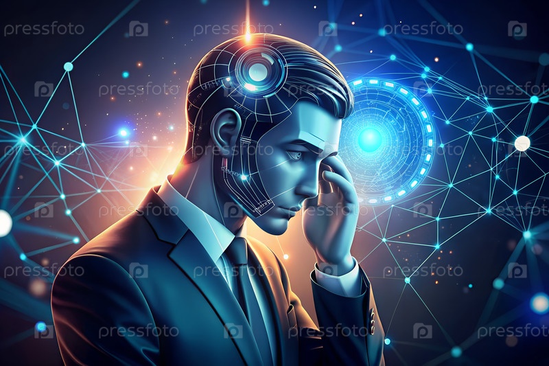 Человеческая касающаяся голова и ИИ-икона против агента ИИ с генеративным искусственным интеллектом