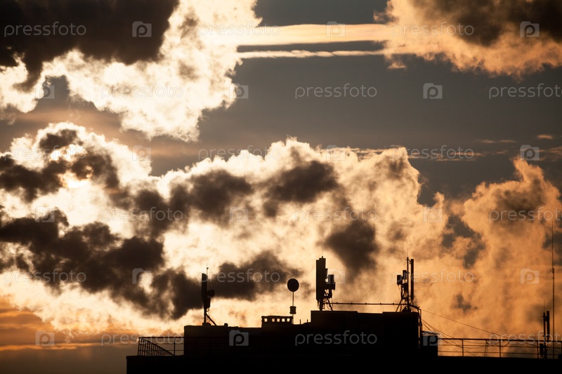 Восход солнца с силуэтами антенны связи с массивом блюд