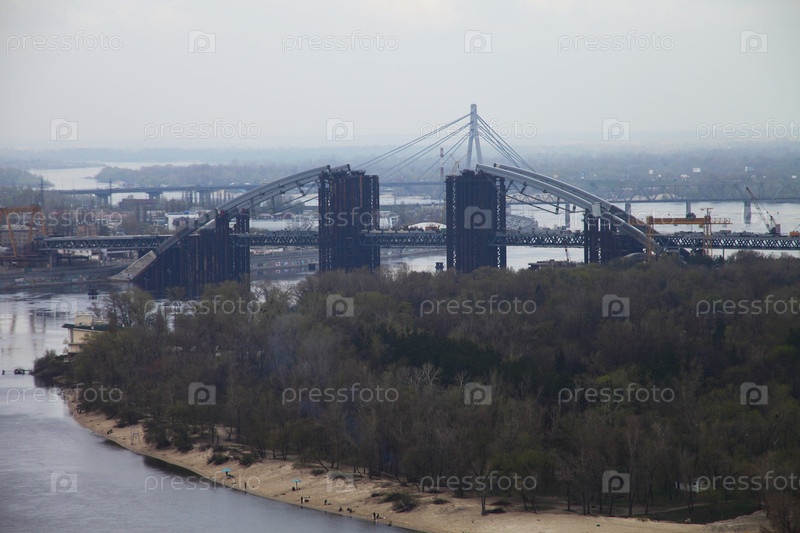 8 марта 2012 года.Киевский городской пейзаж с рекой Днепр и мостом, Украина, Восточная Европа