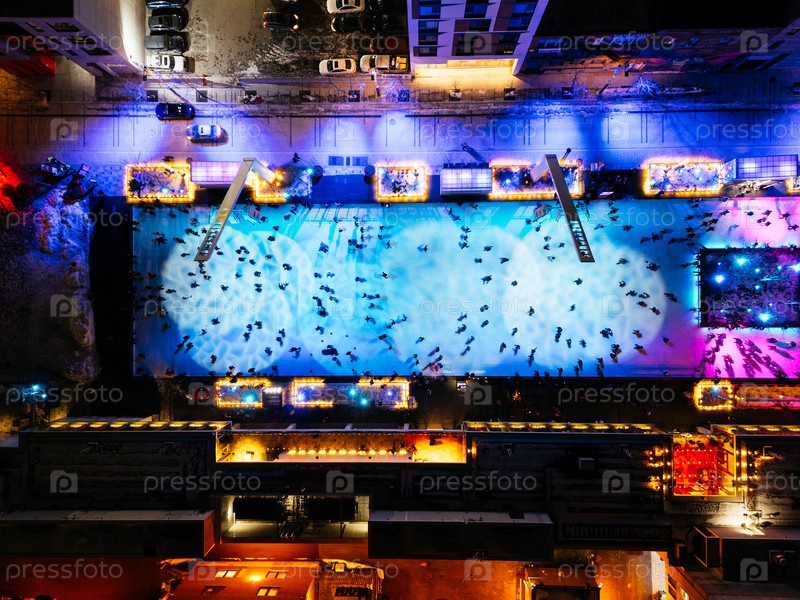 Вид с воздуха катания на коньках в Монреале с красочными огнями и зимним движением