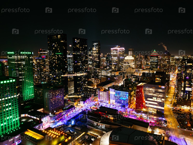 Вид с воздуха катания на коньках в Монреале с красочными огнями и зимним движением