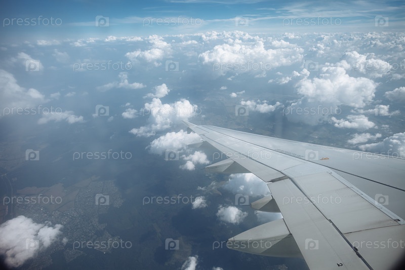 Вид из окна самолета с крылом над белыми пушистыми облаками и голубым небом