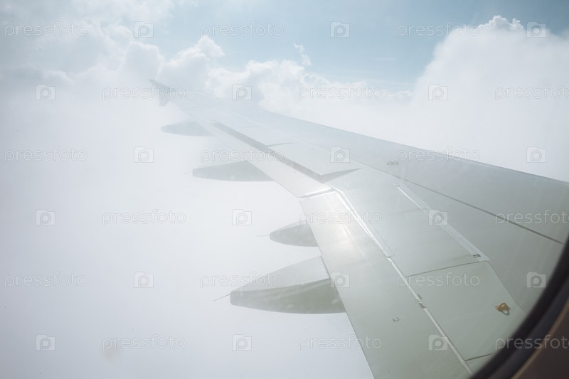 Вид из окна самолета с крылом над белыми пушистыми облаками и голубым небом