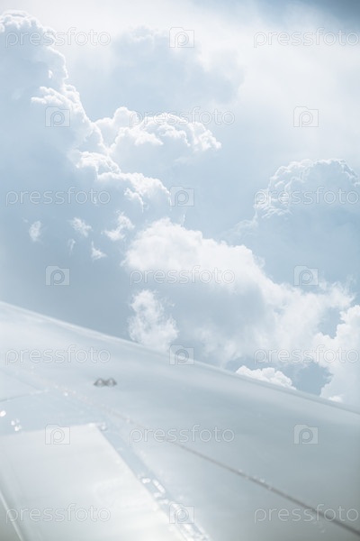 Вид из окна самолета с крылом над белыми пушистыми облаками и голубым небом
