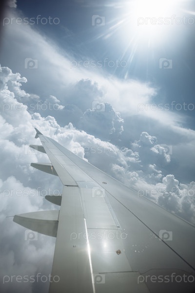 Вид из окна самолета с крылом над белыми пушистыми облаками и голубым небом