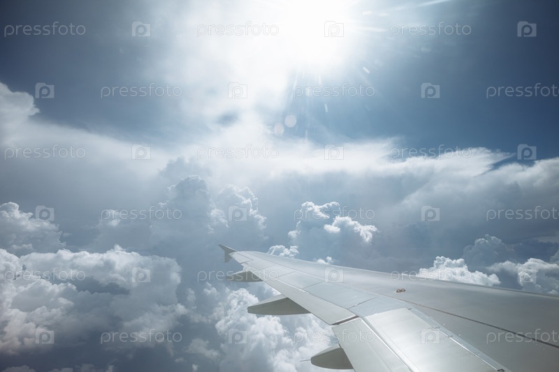Вид из окна самолета с крылом над белыми пушистыми облаками и голубым небом