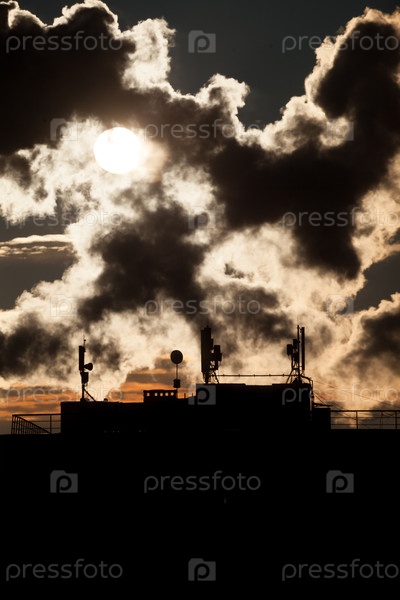 Восход солнца с силуэтами антенны связи с массивом блюд
