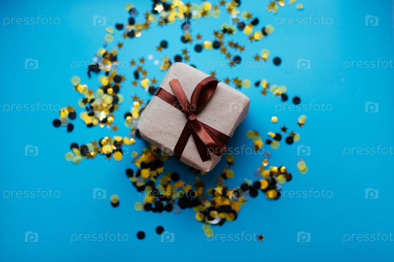 Подарочный ящик с коричневой лентой и праздничными конфетти на синем фоне, яркая праздничная атмосфера
