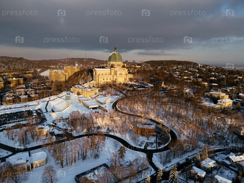 Вид с воздуха Оратория Святого Иосифа на горе Королевской во время захода солнца зимой.Монреаль, Квебек, Канада