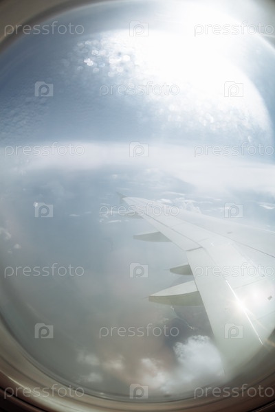 Вид из окна самолета с крылом над белыми пушистыми облаками и голубым небом