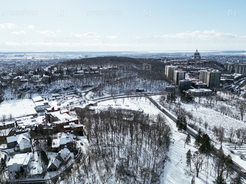Зимний вид на горизонт Монреаля со снежным Парком Маунт-Роял и замерзшим озером Бивер