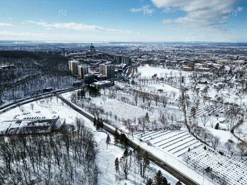Зимний вид на горизонт Монреаля со снежным Парком Маунт-Роял и замерзшим озером Бивер