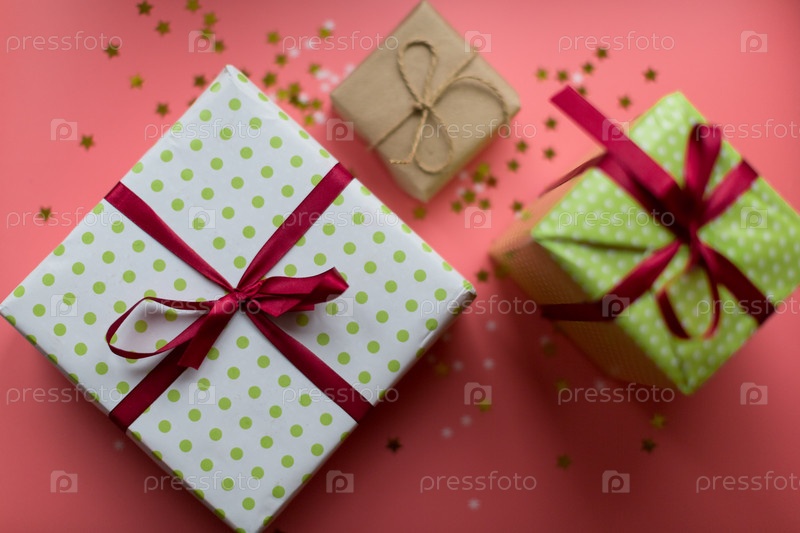 Серебряные коробки для подарков и искрящаяся снежинка на розовом праздничном фоне с конфетти золотой звезды