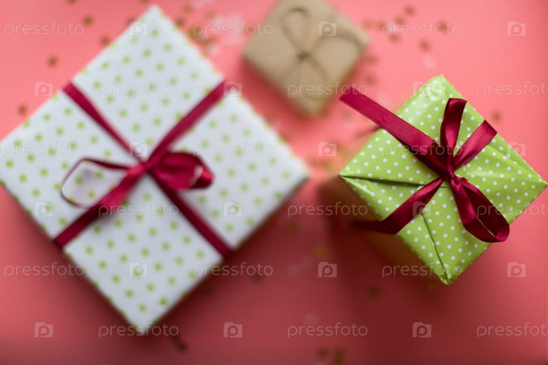 Серебряные коробки для подарков и искрящаяся снежинка на розовом праздничном фоне с конфетти золотой звезды