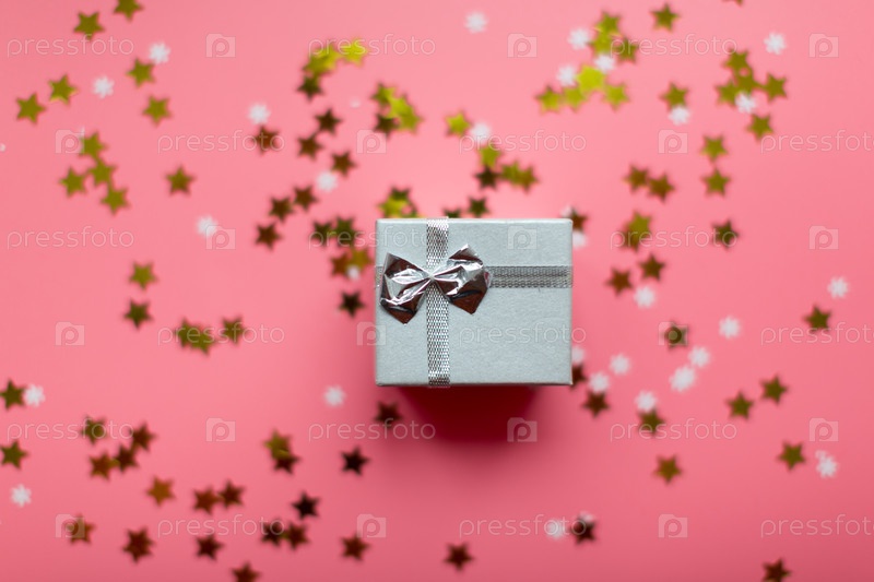 Серебряные коробки для подарков и искрящаяся снежинка на розовом праздничном фоне с конфетти золотой звезды