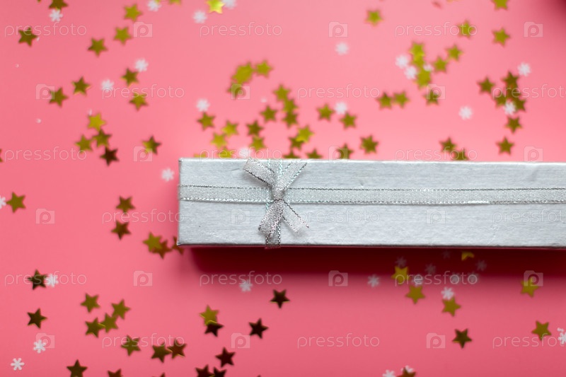 Серебряные коробки для подарков и искрящаяся снежинка на розовом праздничном фоне с конфетти золотой звезды